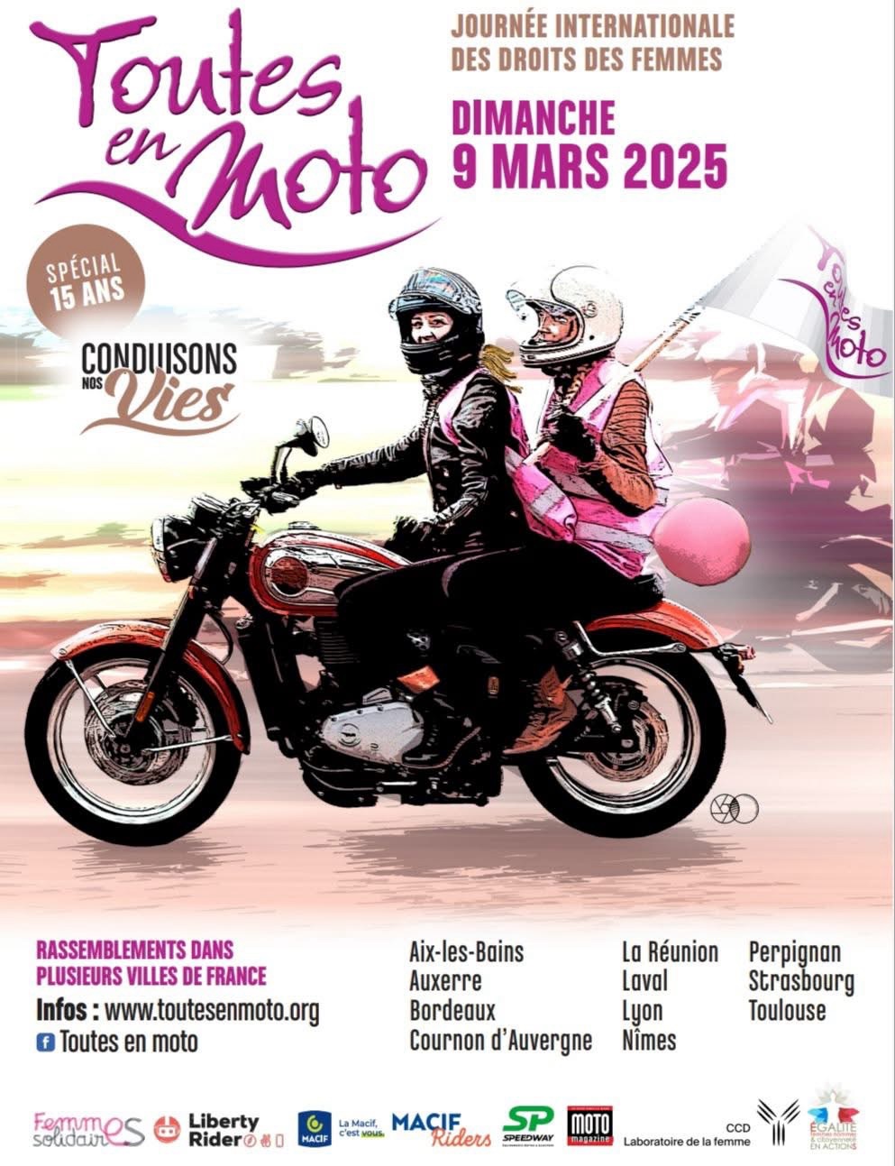 Depuis 15 ans, en marge de la Journée Internationale de défense des droits des femmes, l’association Toutes en Moto organise des rassemblements solidaires un peu partout en France.